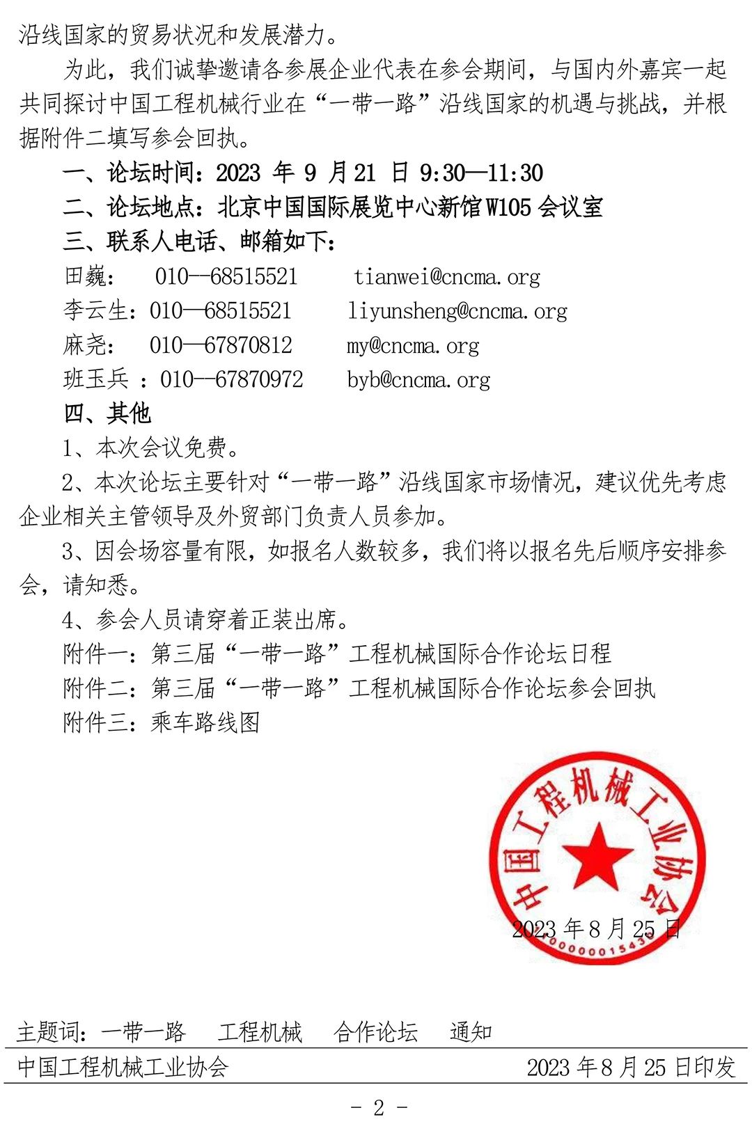 为此,我们诚挚邀请各参展企业代表在参会期间,与国内外嘉宾一起共同探讨中国工程机械行业在“一带一路”沿线国家的机遇与挑战,并根据附件二填写参会回执。