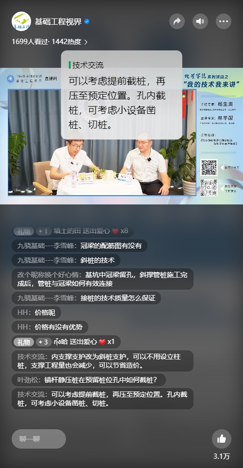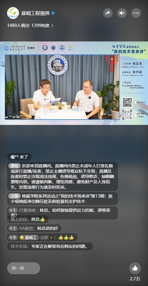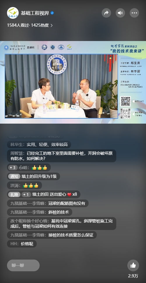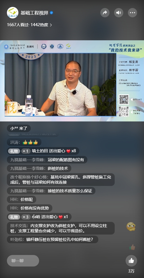 线上观众积极参与互动,踊跃提问,与专家学者共同探讨了相关技术细节和应用场景,气氛热烈。讲座结束后,在线观众纷纷留言表示收获颇丰,对新型静压桩技术有了更深刻的理解,并对未来在实际工程中应用这些技术充满期待。