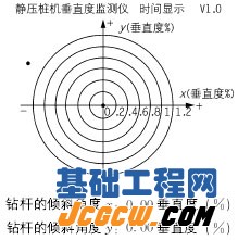 监测仪采用多界面设计,界面的切换是通过按键实现的。首先经过自检界面,然后进入主界面,即监测界面,该界面除显示时间、版本号外,主要用图形和数字相结合的方式显示桩的偏移情况,如图3所示。由于静力压桩机的垂直度要求在5‰以下才算合格,在设计该监测仪时为了满足显示精度和显示效果,采用趋势设计方法,如果超过了图3中圆形的显示区,只是给出点的偏移情况,在数字显示区明确显示偏移的内容,这样有助于操作人员根据趋势调节桩的角度。