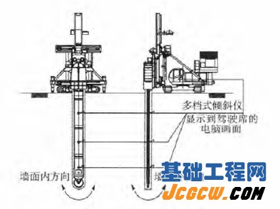 切割箱打入至设计深度后,在切割箱体内安装测斜仪,实时监控切割箱面内与面外的偏差情况,并及时通过驾驶员操控调整,确保TRD等厚度水泥土搅拌墙墙体垂直度满足设计要求,如图1所示。