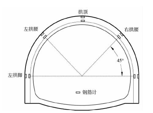 隧道初期支护中的钢拱架在隧道开挖之后主要承受支护后方的围岩压力,由于洞内工序的变化,钢拱架截面上应力分布必然很复杂。现场监测选择在工字钢两侧翼缘布置钢筋计,具体布置见图1。