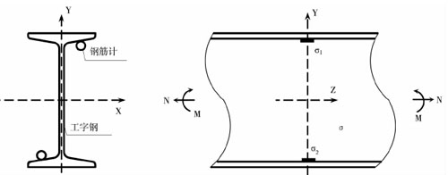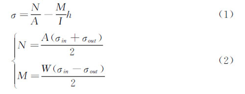 通过现场量测,可得到工字钢两侧翼缘的应力σiN、σout,然后,可认为工字钢横截面上应力分布在σiN、σout之间按线性分布,并假定钢架处于弹性工作状态且不考虑工字钢腹板部位喷射混凝土受力,则根据材料力学相关理论可以计算出工字钢的内力,见公式(1)、(2)及图2。