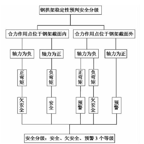 (2)内力判别准则,为了考虑钢拱架作为拱结构的内力情况,按照截面弯矩和轴力的作用状态进行安全性预判,根据软弱围岩隧道变形量大持续时间长、易受到扰动等特点,并综合考虑与应力别准则相对照,将内力判别准则也分为3级:①安全,钢拱架内力较小,合力作用点主要位于钢拱架截面内且洞内侧受压较大时;②欠安全,合力点作用范围位于钢架截面内,当轴力以受压为主、弯矩为正,或者当合力点位于钢拱架截面外,轴力以压为主、弯矩为正时为欠安全;③预警,钢架洞内内侧受拉且弯矩较大时认为钢拱架受力出现不合理,应预警以引起施工单位注意,调整工序并加强观测。钢拱架稳定性分级见图3。