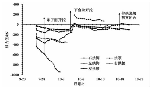 (2)钢架支护的初期阶段和下台阶边墙开挖阶段,其轴力变化较快,随着该阶段施工的结束,钢架轴力迅速趋于稳定,其中下台阶边墙的开挖对钢架的轴力影 响较大,