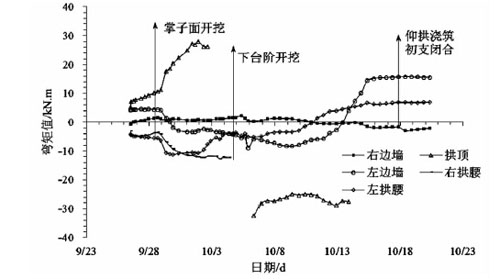 根据前面所述钢拱架内力计算原理,可得监测断面各测点的轴力和弯矩时程曲线,从图4和图5,从中可以看出: