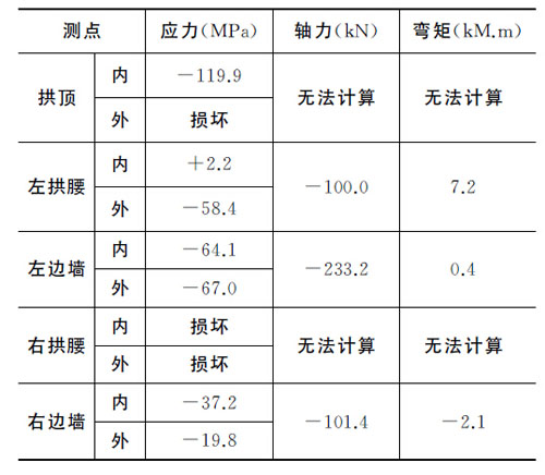 仰拱浇筑后,钢架应力趋于稳定,则此时钢拱架的应力值及内力计算值见表1,由表可见,钢架受力稳定时,轴力均为压力,可见整体处于受压状态,最大压力为233.2kN,截面弯矩较小,计算最大弯矩为7.2kN.m。