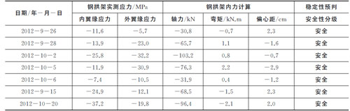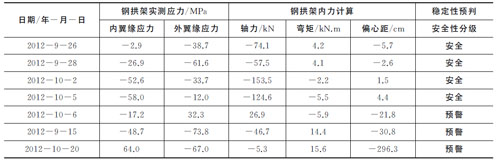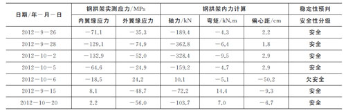 结果显示,该钢拱架安全评级方法能较好地反映实际开挖和支护变化情况,预判结果能基本反映围岩稳定性状态,既能显示钢拱架安全性级别,又能反映其内力变化规律。