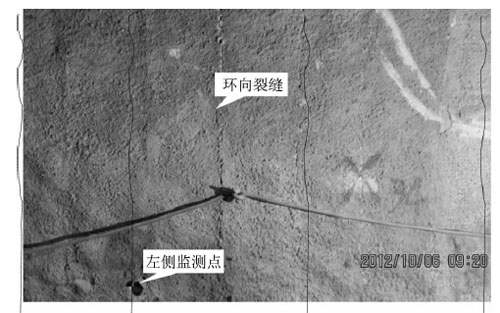 以监测断面钢拱架实测应力为依据,采用应力判别准则和内力判别准则对其进行安全性分析,以左拱腰、左拱脚和右拱脚测点为例,见表2~表4。由左拱腰处稳定性预判计算与安全分级表可知,钢拱架左拱腰在整个监测过程中,大部分时间是安全的,仅在测试断面下台阶左边墙开挖时,边墙处围岩向内挤出,钢拱架安全级别由“安全”下降到“欠安全”状况,随着下台阶边墙钢拱架和喷射混凝土施工的完成,其安全级别上升到“安全”。分析左拱脚的安全级别,可见在测试断面下台阶左边墙开挖时,左边墙钢拱架安全级别由“安全”下降为“预警”,分析原因是下台阶左边墙处开挖宽度过宽,现场观测发现,监测断面附近喷射混凝土出现大量环向裂缝,见图6,在随后的下台阶边墙开挖中减小了开挖宽度。