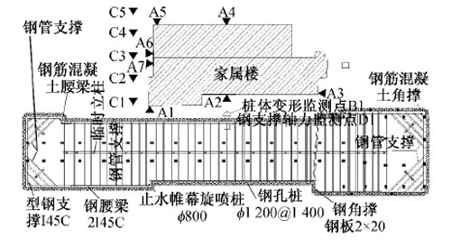 在基坑开挖过程中,为确保安全,按照相关规范对基坑进行了系统的安全监测,在家属楼周围设置建筑物沉降观测点7个(A1~A7),桩体变形监测点1个(B1),地表沉降监测断面1个,其中包括5个监测点(C1~C5),钢支撑轴力监测点1个(D1),监测分析工况如表1所示,监测点布置如图1所示。
