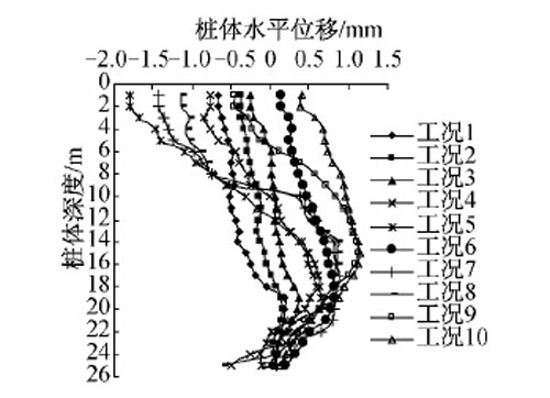 从开始施工到基坑完工,对临近家属楼的桩体位移进行了监测。测斜孔的顶部与桩的顶部是齐平的,测斜孔孔深都设为26m。不同工况下桩体变形规律如图2所示,其中,桩体变形曲线图中正数表示桩体向基坑内侧偏移。