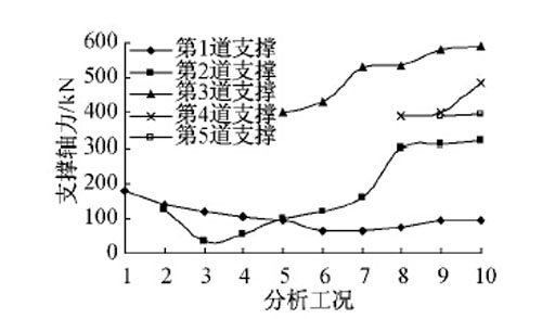 由于基坑围护结构承受着基坑开挖卸荷所产生的土压力和水压力,并将此压力传递到支撑上。因此,支撑系统的安全是关系基坑稳定的重要因素。对于支撑体系的内力监测可以有效地监控支撑体系的受力状态,预示危险信息,考虑到基坑开挖深度较大,在支撑上会产生较大的轴力,通过对支撑轴力的监测可以指导施工,防止由于轴力过大使支护结构发生破坏。由于深基坑失稳而引发的工程事故非常多,所以这项监测的意义很大。同时通过对监测结果的分析,还可以优化调整支撑的位置,甚至减少支撑层数,提高支撑效果。本工程钢支撑轴力监测结果如图3所示。