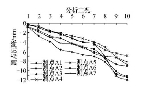 从图4中可以看出,家属楼的沉降大致可分为3个阶段,第1阶段为均匀沉降阶段,该阶段整栋建筑物几乎均匀下沉,累积沉降最大的测点是A1测点,该部分沉降主要是由于基坑开挖引起的。第2阶段为差异沉降阶段,该阶段各测点的沉降已不像第1阶段那样均匀下沉,而是发生明显的差异沉降,7个测点中沉降最大的仍然是位于基坑较近的A1测点,沉降较小的是位于基坑较远的A4测点,基坑开挖使建筑物靠近基坑一侧的沉降比远离基坑一侧的沉降大,沿基坑长度方向最大沉降差为1.1mm,沿基坑宽度方向最大沉降差为2.6mm,均在安全允许的范围内。第3阶段为沉降稳定阶段,各测点测得的沉降速率出现明显的减缓趋势,建筑物的沉降开始趋于稳定,沿基坑长度方向最大沉降差为0.5mm,沿基坑宽度方向最大沉降差1.6mm,最终差异沉降控制在设计范围内,未引起建筑物出现裂缝。
