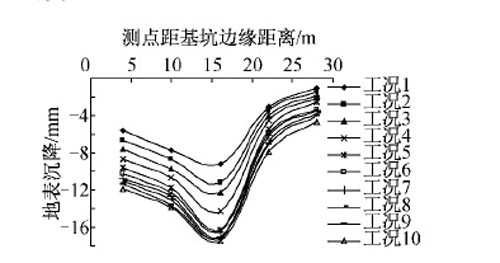 从图5中可以看出,在基坑开挖过程中,最大沉降点并不是距离基坑边缘,而是始终发生在距基坑边缘一定距离处,基坑的最大沉降点位于距离基坑边缘13~15m的位置上,整体沉降形状类似于勺形,且随着基坑开挖深度增加,沉降峰值逐渐向基坑边缘靠近。在整个基坑开挖过程中,最大的地面沉降值达到了17.5mm。每开挖一步,坑后地表都有一定量的沉降的增加,增加量逐渐减小。每步形成的沉降分布曲线形状相似。