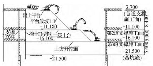 首道对撑与出土坡道有效形成出土通道,同时首道支撑兼作堆料平台,充分缓解了城市中心区现场用地紧张的现状,具有较好的综合经济效益。