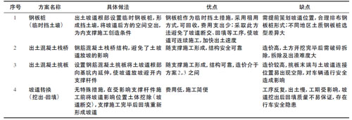 1)第2,3步土方开挖时,采用设置直接进入基坑内的土方坡道、土方车直接进入基坑内装土的方法进行,以加快挖土进程。考虑到出土坡道根部反向放坡土体会将部分内支撑杆件覆盖,影响此区域内支撑施工,工期较长。为解决上述难题,将各种解决方案进行了对比(见表2),最后确定采用在坡道根部植入钢板桩形成临时挡土墙,利用对撑与出土坡道形成有效出土通道的方式(见图2),有效规避了反向放坡土体影响支撑施工的难点,保证了支撑与土方开挖的连续作业,减少了措施难度、降低了成本。