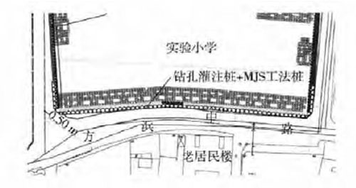 实验小学南面方浜中路侧围护结构靠近居民区,围护施工对周边居民区老式建筑影响较为明显,且受限于上部高压线净空限制。通过对各项施工技术的对比和分析研究,最终采用MJS工法桩作为止水帷幕,应用于围护体系中。、