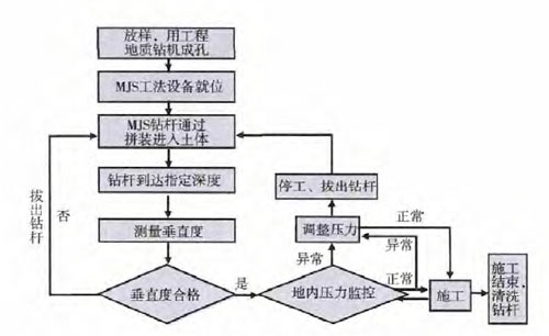 本工程围护体系的MJS工法桩桩径为2400mm,搭接长度为700mm,桩身长度为16m。桩体截面角度为180°,在部分转角部位及与原灌注桩搭接处桩体截面角度为360°。施工前采用工程钻机施工导孔,图4为工艺流程。