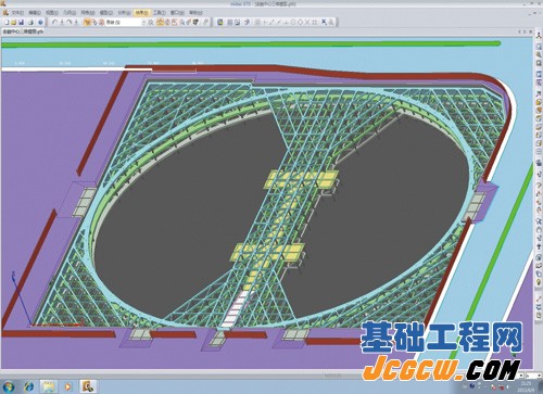支护结构约880延米,开挖深度17.0~22.0m。采用地下连续墙+(3~4)道钢筋混凝土水平内支撑。通过对井字撑、十字撑、田字撑等支撑方案进行比选,最终采取四周角撑,中间设一椭圆内支撑(长轴直径240m,短轴直径180m),中间对撑兼做施工栈桥的支撑方案(见图2)。采用这种支撑体系,基坑净空面积大,极大地方便了施工。三维模型及空间计算分析如3所示。