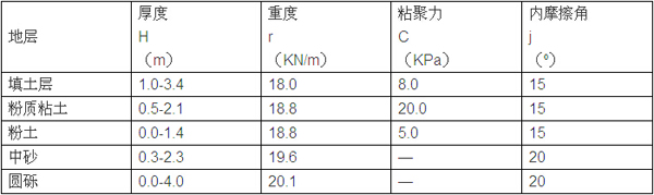 基坑安全系数Ks=1.5,基坑四周堆载距坑壁1.5m以外堆载,根据周边环境,结合工程类比,设计支护参数分为六类: