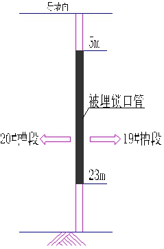 某地下连续墙施工项目在完成20#槽段混凝土浇筑后,东侧(靠近21#槽段侧)锁口管顺利顶拔出;西侧(靠近19#槽段侧)锁口管在即将顶拔出第4节时,第4节与第5节接头销钉发生断裂,以致西侧最下部2节(第5节与第6节)共18m锁口管被埋在导墙面以下5~23m处,具体位置见下图所示: