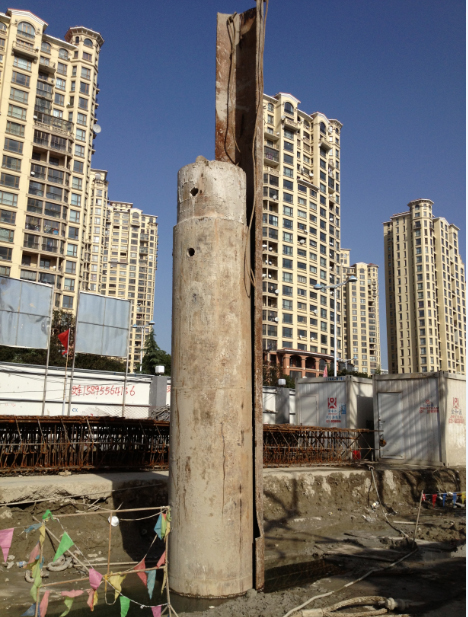 (3)、锁口管背后回填不密实,混凝土浇筑时,混凝土顺着锁口管与槽壁之间的间隙流至锁口管背后,混凝土凝固后将锁口管握裹,导致锁口管与混凝土间的粘附力增大,顶拔时,顶拔力过大导致锁口管接头销钉断裂。