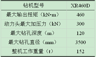 本文结合徐工XR460D旋挖钻机(钻机性能见表1)在徐州三环路高架桥中的施工进行研究。此工况地质条件较复杂,岩层主要以灰岩为主,灰岩裂隙中等发育,且灰岩中溶洞发育多以中小型溶洞为主,灰岩最大饱和单轴抗压强度达90Mpa、钻孔直径在2m-3m之间,钻孔深度30m左右,施工难度较大,国内类似工况施工因为效率低、机器故障率高等问题,用户不能得到满意的经济收益,致使旋挖施工工法未在该工况施工中得到推广。