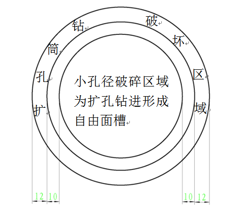 为保证扩孔钻进时,小孔径破碎所形成的自由面,对扩孔钻进的有益影响,需保证筒钻内齿距小孔外径在10cm左右,加上筒钻破碎时自身所形成的12cm的圆环槽,便可确定分级方法。