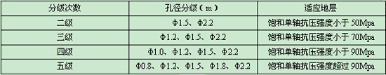 由以上理论确定的每相邻钻孔直径差控制在44cm左右,但上述理论是建立在岩石完整的基础上,由于实际工况中,岩石存在一定破碎,且破碎程度差异较大,故实际分级时每相邻钻孔直径差控制在40-70cm,具体选择需根据地质资料。