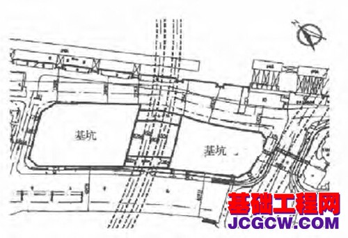 某大规模深基坑工程位于上海市中心,基坑挖深约14m,长约190m,宽60m,由于运营中的地铁隧道位于工程正下方,基坑被分为南北2个小基坑,2个基坑距离地铁水平距离均为8m左右,基坑之间通过8m宽的车行通道连接(图1)。此外,在基坑南侧紧邻另一条隧道,最近间距为7m左右。