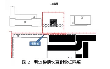明远楼两侧有4棵枝繁叶茂的古树,其与明远楼形成一个极为融洽的风景。为避免在施工过程中对这4棵古树产生破坏性的影响,因此,在进场施工之前,在4棵古树与基坑边之间插入了一排9m深的拉森钢板桩,使其根系与施工区域之间形成一道人为的屏障,尽可能的减少对其的破坏。