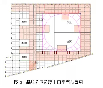 为了满足结构受力以及有效传递水平力的要求,利用中间环形支撑位置作为最大的取土口使用。西侧取土口布置利用楼板结构考虑30~35m进行布置,见图3。