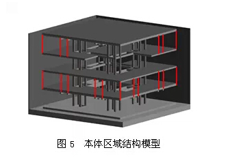 在大开孔区域内为博物馆本体,其与周边区域相互脱开,作为一个博物馆主体需要特殊的展陈要求以及独特的建筑表现形式,底板处为一个大空间形式,各层楼板外围处于一个悬挑状态,因此提出了一个“上挂下托”的结构形式,见图5。由于与传统的结构形式有所不同,盲目按照传统施工工序进行施工可能导致与设计工况不符,导致结构的安全隐患。因此,利用软件模拟可能发生的工况条件,从而确定最终的施工方案。