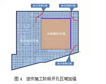 (2)工程四层地下室周边采用开放式逆作法施工,在逆作法阶段采用大开孔圆环支撑,直径达到46m,正常使用阶段将圆环支撑拆除,周边逆作区域与本体顺做区域之间完全脱开。形成一个完成开放性的结构形式。