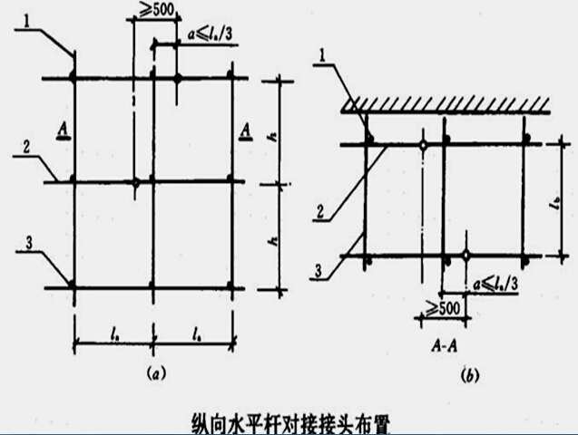 纵距水平杆接长宜采用对接扣件连接,也可采用搭接(搭接必须符合:搭接长度不应小于1m,应等间距设置三个旋转扣件固定,端部扣件盖板边缘至搭接纵向水平杆杆头的距离不应小于100mm)