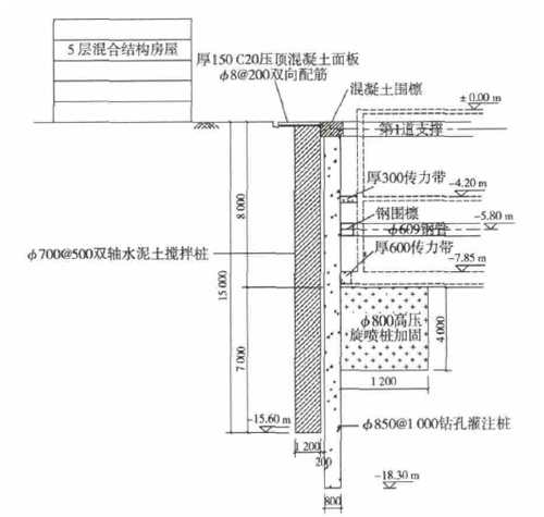 本工程地下室围护墙采用Φ800 mm钻孔灌注桩,间距950 mm,桩长16 m,南侧在靠近金林商务楼的地方局部采用Φ850 mm@1000 mm的钻孔灌注桩。在钻孔灌注桩外侧则采用Φ700 mm的二轴水泥土搅拌桩形成止水帷幕墙,止水桩桩长15 m,桩身搭接长度为200 mm。为使整个支护结构形成良好的整体性及方便地下室结构施工,在桩顶处设置宽2 m、厚150 mm的C20钢筋混凝土压顶。图2为邻近建筑物的支护剖面图。