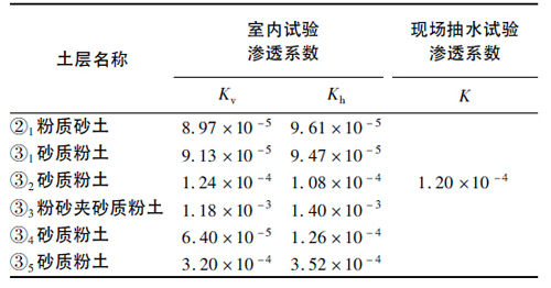 本场区为钱塘江西岸的冲海积平原,地貌形态单一,地势平坦,场区内地下水埋深0.90~3.10m,受季节影响变化幅度大,承压水对本基坑影响不大,主要为潜水层。开挖土层主要有:①1层杂填土、①2层素填土、②1层粉质砂土和③1层砂质粉土,地铁盾构区间位于③4层砂质粉土,主要开挖土层的渗透系数如表1所示。