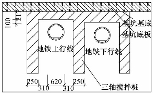 下沉广场周边按设计的景观缓坡式放坡,部分地段采用挂网锚喷,地铁盾构区间范围为本基坑的核心区,地基加固采用850@600的三轴搅拌桩满堂套打加固,剖面呈“门”字形(见图2),其中隧道两侧土体加固深度为24.5m,距隧道管片最近为3.1m,共1260组,隧道正上方土体加固深度为6.79m和8.85m,距隧道管片仅1.0m,共4410组(三轴为1组);其余广场南、北两侧简称为非核心区。