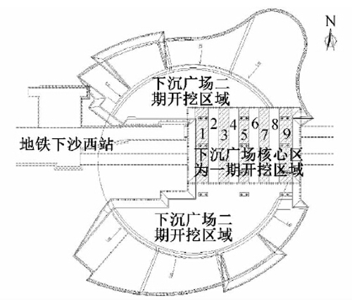 根据地铁隧道保护和施工总体进度要求,施工开挖分两期进行,一期为广场隧道盾构穿越段,即核心区土方开挖,该区域长53.4m、宽33.2m;二期为广场南、北两侧非核心区开挖。