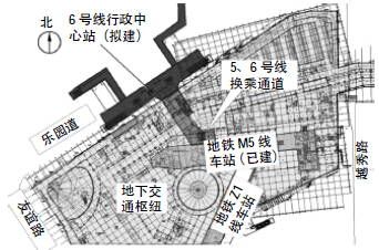 天津市文化中心地下交通枢纽地处天津中心城区,位于市政府旁的友谊路东侧,涉及3条轨道交通线路。根据轨道交通规划,需在既有地下商业空间下方新增换乘通道,以实现L5文化中心站和L6行政中心站的付费区换乘。为减少对文化中心地面景观绿化的影响,利用既有地下空间结构顶板作为天然盖板,采用盖挖加层的方式将既有一层地下空间改造为地下二层。换乘通道总平面图见图1。