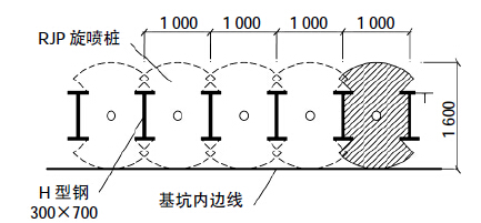 考虑既有地下结构6.3~7.7m的净空高度,而且紧邻L5文化中心站,受工艺和设备的限制,常规的地下连续墙、钻孔灌注桩、SMW工法等均无法实施。而高压旋喷工法具有施工设备小型化的特点,一直都被作为在狭隘场所施工的首选工艺。为解决低净空条件下围护结构施工难题,借鉴SMW工法的基本原理,由RJP设备高压旋喷形成止水帷幕,液压振动锤分节压入H型钢承受水土压力,两者共同形成复合围护结构。传统的SWM工法是先旋喷搅拌,后插入型钢,为避免泥浆硬化后影响型钢的插入,采用先将型钢插入底层,再在型钢间进行旋喷的施工工艺,即IBG工法(见图2)。