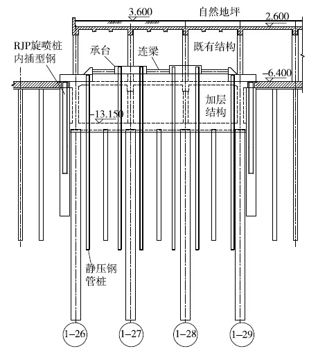 既有地下空间结构净高为6.3~7.7m,围护结构剖面图见图3。换乘通道向下暗挖高度为7.45m(加层后结构底板埋深约为18m),通道东、北、西向新施工的围护结构采用φ1600mmMJS旋喷桩内插H型钢(700mm×300mm×13mm×24mm)。北侧利用原文化中心地下交通枢纽围护结构(800mm厚地下连续墙)及RJP旋喷桩内插型钢形成复合围护;南侧利用既有L5围护结构(800mm厚地下连续墙,地下墙深29.4m)。新实施的围护结构和原地下墙相接形成封闭结构。对于底板局部落低(集水坑、自动扶梯坑等)及兼作托换桩处的RJP内插型钢桩桩长均作相应加强处理。
