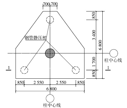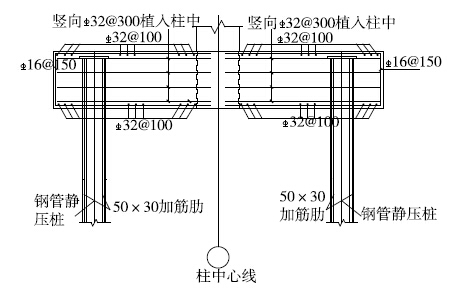 结构托换采用托换承台加连系梁的方案。在原有地下空间的结构柱四周压入钢管桩后,在钢管顶部制作承台,承台与原结构立柱通过柱齿槽和锚筋连接,钢管桩上焊接锚筋与承台链接,即采用一承台多桩的形式。在底板上浇筑联系梁,保证在切除底板后地下结构仍有较高刚度和较好的整体性。承台的平面布置见图4,典型承台结构见图5。