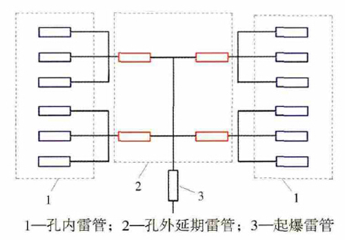 在微差爆破中,由于受到雷管段别的限制,使得大规模微差爆破难以实现,而采用孔外延期爆破技术可以扩大单次微差爆破规模。孔外延期是指将单次起爆炮孔分为若干组,每组孔内采用同一段或者不同段雷管,组与组之间采用不同段雷管并联的一种起爆方式。采用孔外延期爆破网络时,应注意防止孔外延期雷管与孔内雷管的连线被飞石砸断。孔外延期网络如图1所示。