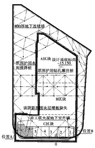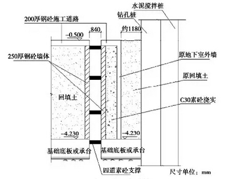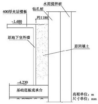 (2)在新地下室部分围护体施工困难的情况下,可以利用原地下室的一些结构来替代,同样可以达到围护的效果。