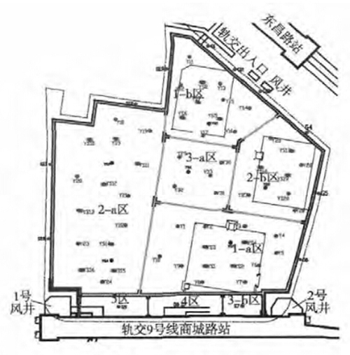 基坑总占地面积约41 500m2,围护结构采用地下连续墙,沿基坑外侧地下连续墙深度为48 m,坑内部分隔墙深度为38 m。临近轨交9号线区域地下3 层,面积约3000 m2,开挖深度16.2 m,设有4 道水平支撑,其中首道为混凝土支撑,其余3 道为钢支撑,基坑内开挖深度范围内采用搅拌桩和旋喷桩加固;其他区域地下4 层,面积约38500 m2,开挖深度19.5 m,设有4 道混凝土支撑。