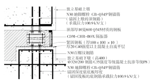 (c)待混凝土达到强度后拆模,用防水胶纸包裹钢筋螺纹部分,在四周表面铺设厚20mmC40强度以上混凝土自流平层,然后根据图纸安装CDM-CHR-BOX隔振器。