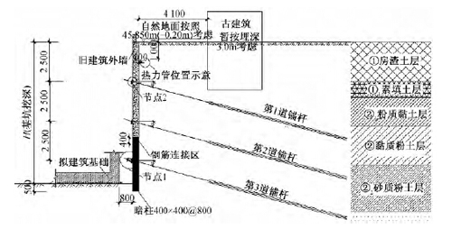 3)原地下结构外墙外侧存在旧支护桩,原有的旧支护桩锚入地下深度不够,不足以满足本工程需要。在该部位重新施工新的支护桩,工期长、造价高,且会造成对市政管线、古树根部和古建筑的破坏。