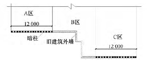 暗柱施工时,为了保持支护过程中既有结构外墙的稳定性,墙体下暗柱不宜同时施工。本工程将暗柱施工分为3个区域(见图3),先进行两边部分(A区和C区)的暗柱施工,待施工完成后再进行中间部分(B区)的暗柱施工。