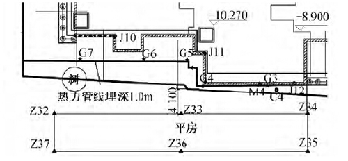 2)基坑周边环境复杂,原半地下停车场南侧外墙外侧存在需要保护的古树、古四合院会所和埋深约1.0m的热力管线,且施工期间必须保证该热力管线的安全运行。若是按常规工艺进行护坡,容易造成周边管线破坏和文物破坏。