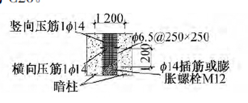 在保留的地下结构墙体下设置型钢暗柱支撑,型钢暗柱尺寸400mm×400mm(同墙厚),高3.5m,置于保留的地下结构墙下,水平间距0.8m,下部嵌入基底0.5m,柱身混凝土采用喷射混凝土,强度等级C20,保护层厚50mm。暗柱内型钢采用I22b,型钢上端与保留的结构墙体钢筋进行焊接。